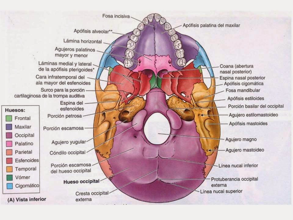 Base del cráneo (vista inferior) La base del cráneo se extiende posteriormente desde las líneas nucales superiores de los huesos occipitales, hasta los incisivos superiores anteriormente. Este aspecto del cráneo contiene muchas estructuras importantes, incluyendo el foramen más grande del cráneo, el foramen magno. Esta parte la podemos.