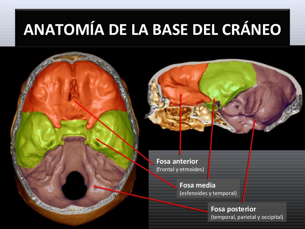 La base anterior del cráneo forma la parte inferior del cráneo anterior, separando la fosa craneal anterior de los senos paranasales y las órbitas . Figura 1: Reconstrucción volumétrica observando desde superior la base de cráneo de una tomografía computada, identificando la fosa craneal anterior, media y posterior.