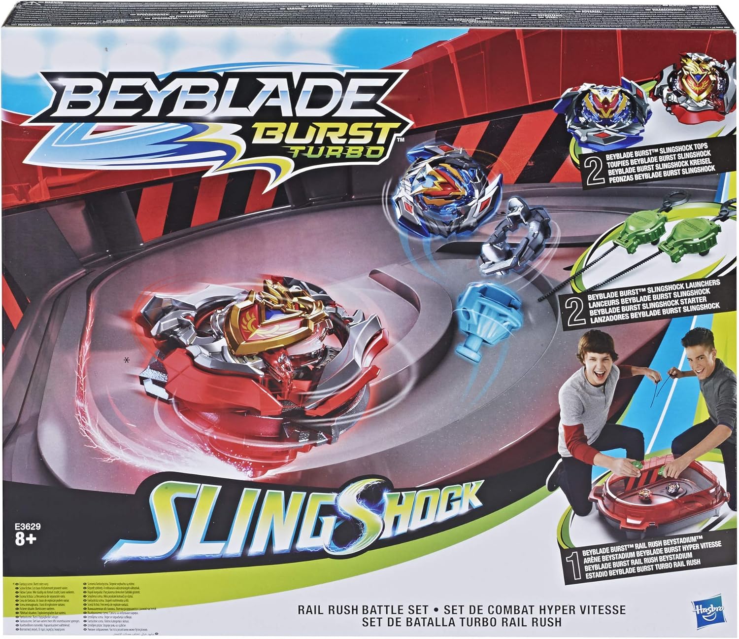 Let it rip! • Includes Beyblade Burst Slingshock: right-spin tops (2), right/left-spin launchers (2), Rail Rush Beystadium (1), and instructions. • Rush into battle with a dual rail system that amps up head-to-head battling using Beyblade Burst Slingshock tech. • Bladers can vary their attacks by launching in different sections of the.