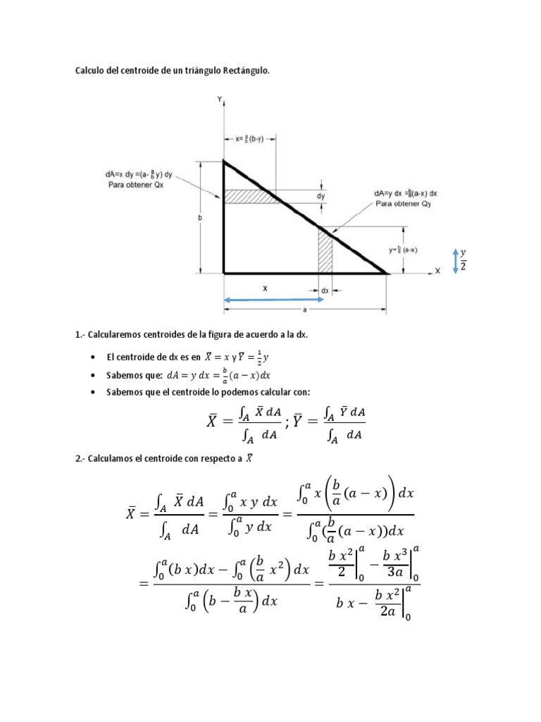 El problema es clásico: Encontrar el centroide de un triángulo rectángulo genérico como el de la figura: Solución Centroide X. Después del rectángulo, este es uno de los problemas más fáciles de resolver en cuanto a centroides de figuras geométrias. Se debe conceptualizar un diferencial de área mapeando entre los límites 0 y b para.