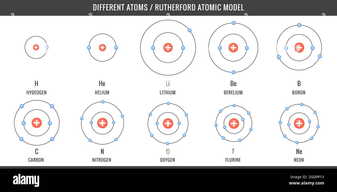 Diferentes átomos, modelo atómico más simple de hidrógeno, carbono, oxígeno, nitrógeno