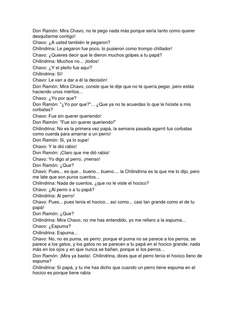 CHAVO DEL 8 REGRESO A LA ESCUELA. 1º ESCENA. ENTRA DON RAMÓN CHILINDRINA DOÑA FLORINDA Y QUICO. Don Ramón: si mi hija vámonos. Chilindrina: no, no, espera se me olvido mis cuadernos. Doña Florinda: Ahora si Quico vámonos. Quico: no, no, espera yo también olvide mis cuadernos. Doña Florinda: no sé cómo el prof. Jirafales acepta en la escuela a ciertas criaturas.