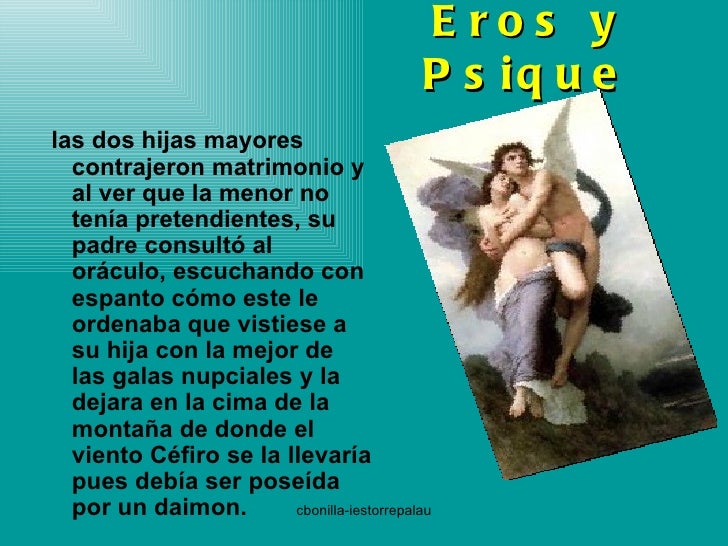Mito Griego: Eros y Psique. En los albores del mundo vivían en Grecia, tres hermosas princesas. La belleza de las hijas del rey era alabada por el pueblo entero. Las hermanas mayores no tardaron en casarse y se fueron a vivir con sus esposos. Psique, la hija menor, no tenía pretendientes. Era bella como el amanecer, sin embargo, ningún.