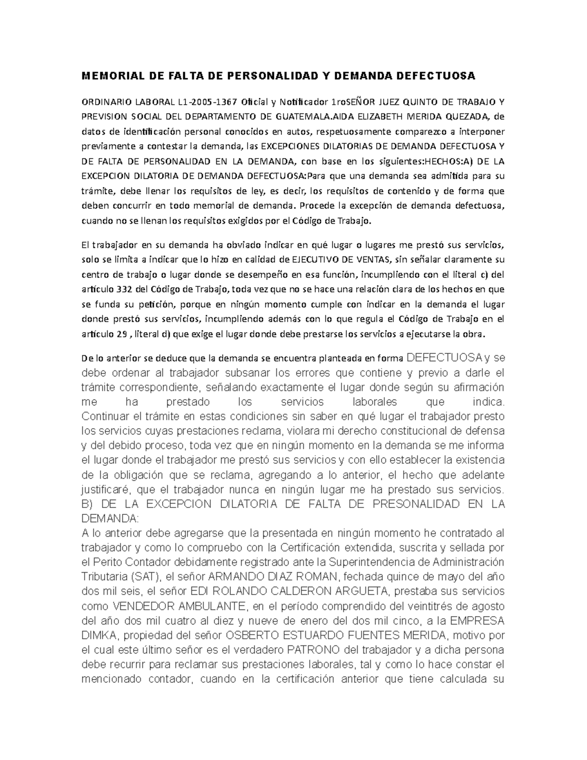 Memorial DE Falta DE Personalidad Y Demanda Defectuosa MEMORIAL DE FALTA DE PERSONALIDAD Y