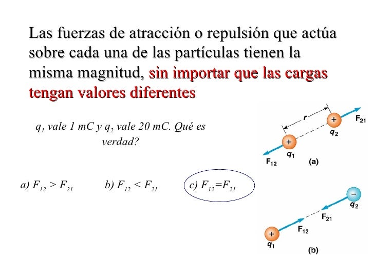 k e = 8.89 x 10 9 N.m 2 / C 2 ≈ 9 x 10 9 N.m 2 / C 2. La figura 1 ilustra la interacción entre dos cargas eléctricas: cuando son del mismo signo se repelen, de lo contrario se atraen. Nótese que la ley de Coulomb se ajusta a la tercera ley de Newton o ley de acción y reacción, por lo tanto las magnitudes de F 1 y F 2 son iguales, la dirección es la misma, pero los sentidos son contrarios.