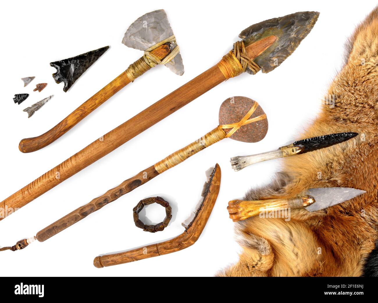 Herramientas de la Edad de Piedra sobre fondo blanco Artesanía de la Edad de Piedra Fotografía