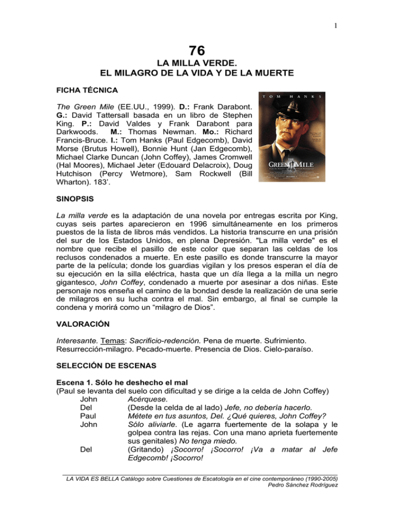 Sinopsis Título original: "The Green Mile". Estados Unidos, año 1932. Paul Edgecombe es un guardia de la prisión de Cold Mountain, lugar en donde los condenados a muerte recorren la denominada milla verde para acabar ejecutados en la silla eléctrica. Uno de esos presos es John Coffey, un gigante con mente de niño. Novela de