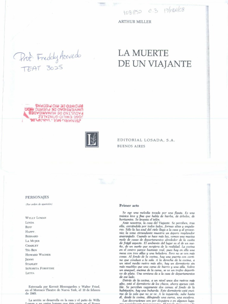 Arthur MILLER, La muerte de un viajante, edición y traducción de Ramón Espejo Romero, Madrid, Cátedra, 2010, 328 pp. LA MUERTE de un viajante es, como es bien sabido, la obra reconocida unánimemente como la obra cumbre del teatro de Arthur Miller y, para muchos, la obra más emblemática del teatro estadounidense del siglo XX, un texto teatral que, como nos recuerda el autor de la.