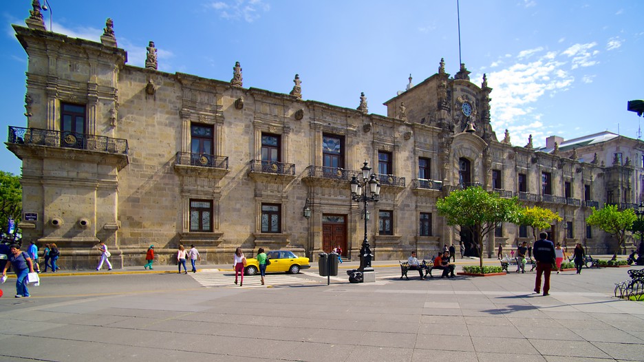 Palacio de Gobierno. El Palacio de Gobierno es una bella muestra arquitectónica del Centro Histórico de Guadalajara que ilustra folclóricamente a la Plaza de Armas y su bello quiosco estilo francés. El edificio fue construído en 1650, pero fue derrumbado por un temblor en 1750, posteriormente la fachada principal fue reconstruída con.