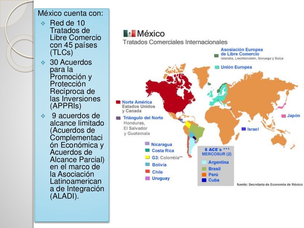 México cuenta con una red de 14 Tratados de Libre Comercio con 50 países (TLCs), 30 Acuerdos para la Promoción y Protección Recíproca de las Inversiones (APPRIs) con 31 países o regiones administrativas y 9 acuerdos de alcance limitado (Acuerdos de Complementación Económica y Acuerdos de Alcance Parcial) en el marco de la Asociación Latinoamericana de Integración (ALADI).