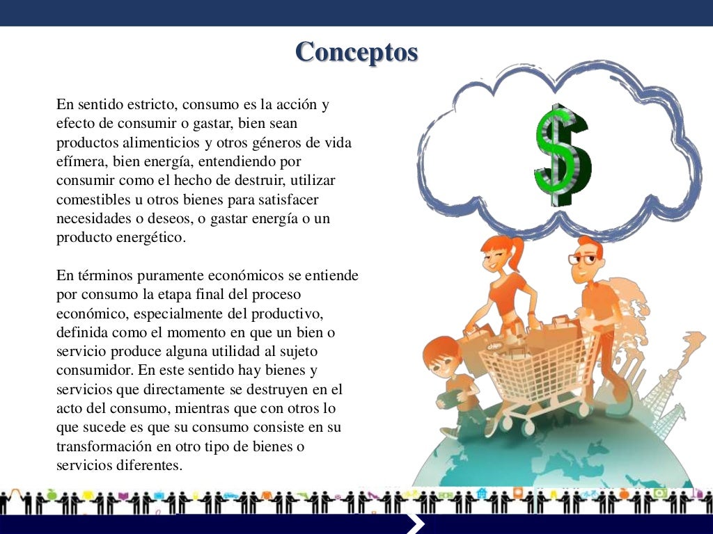 Por 09/01/2024. El consumo se define como la acción y la adquisición de un bien o servicio. Este concepto de consumo implica todo aquel conjunto de productos y servicios que están puestos a disposición de la sociedad para satisfacer una necesidad o un deseo, una necesidad que puede ser primaria o secundaria. Con el paso del tiempo esta.