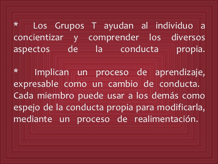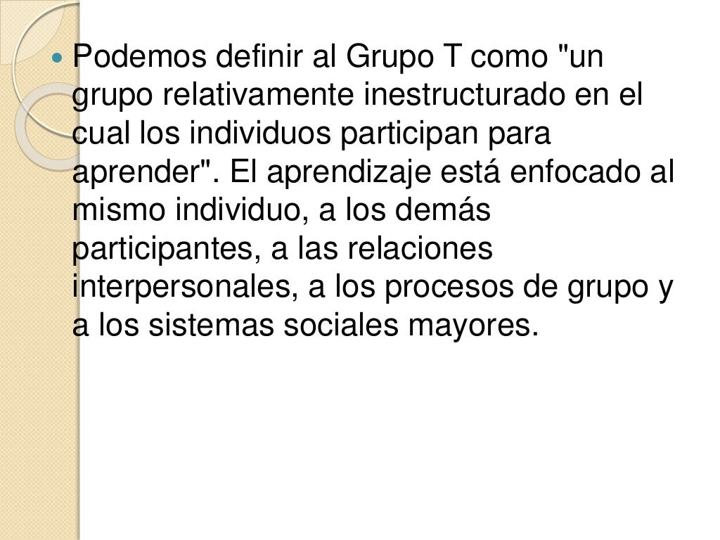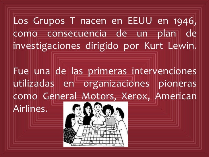 QUE SON LOS GRUPOS T? Se conoce como una de las raíces entrenamiento de laboratorio de sensibilización, con grupos esencialmente reducidos y no estructurados, en los cuales cada uno de los participantes aprenden de sus propias interacciones y de la dinámica en evolución del grupo se empezó a desarrollar desde 1946.