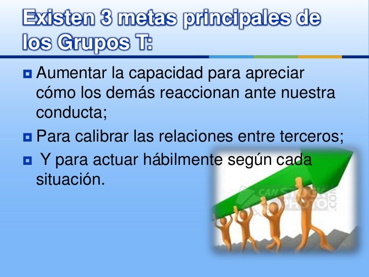 Los objetivos de los grupos "T" son proporcionar a los empleados una mayor conciencia de su conducta y de la forma en que otros los perciben, mayor sensibilidad ante el comportamiento ajeno y un mejor conocimiento de los procesos de grupo. Los resultados específicos que se logran incluyen una mayor capacidad de empatía, el.