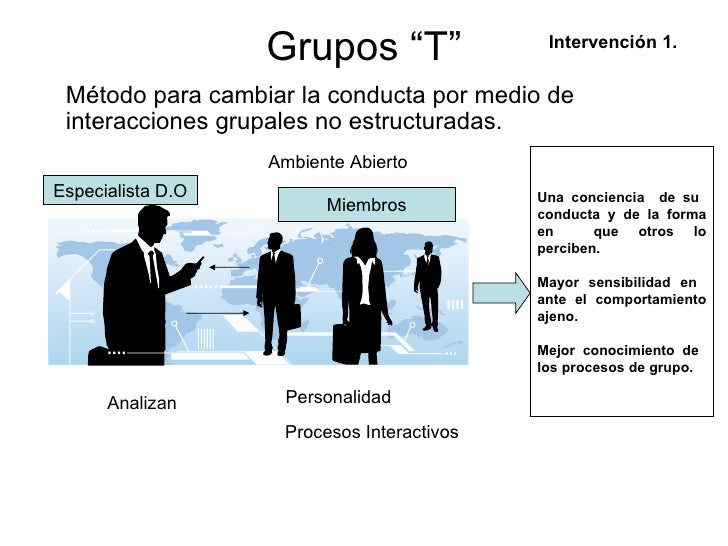 2. El grupo «T» debe vigilar el desarrollo del programa de DO. 3. El grupo «T» es más eficaz en organizaciones donde se comparte la información, están orientadas hacia el cambio y encaminados a resolver conflictos. Cuando se logran estas condiciones, los grupos «T» pueden mejorar tanto el desempeño individual como el del grupo.