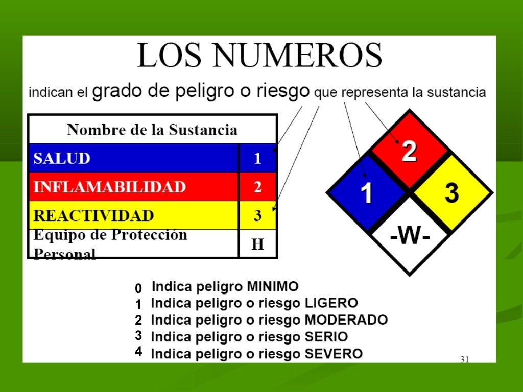 El rombo de los materiales peligrosos está dividido en cuatro secciones. Cada sección tiene un color distinto y un número. El color se asocia con diferentes tipos de peligros.. Nivel 2: materiales que normalmente son estables pero que pueden sufrir cambios químicos bruscos a temperatura y presión elevada. También se incluyen materiales.