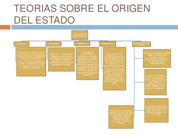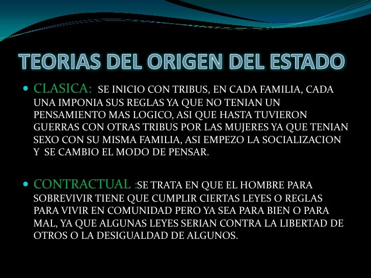Teorías sobre el origen del Estado. Existen varias teorías que buscan explicar el origen del Estado. Algunas de ellas son: Teorías organicistas: Estas teorías consideran al Estado como un organismo vivo que se desarrolla y evoluciona. Teoría de Hegel sobre el Estado: Hegel plantea que el Estado es la máxima expresión de la libertad y la.